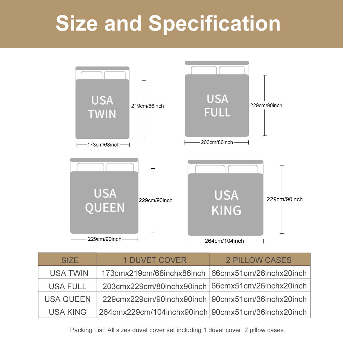 -King-size (104x90’’) – 2 shams (20x36’’)
