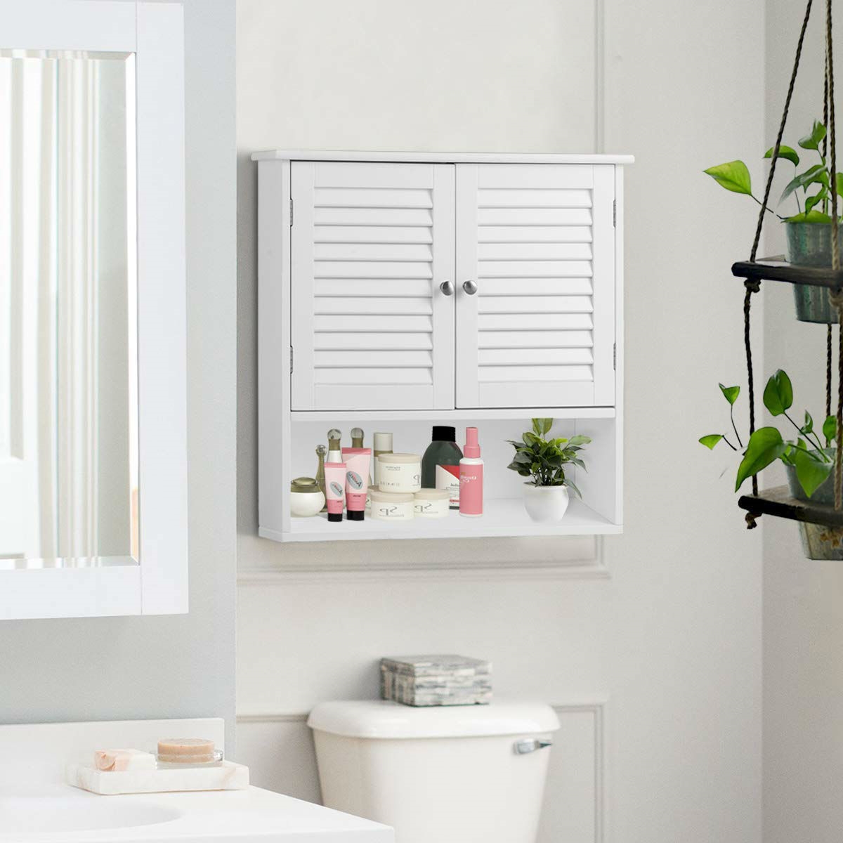 White Wall Mount Bathroom Cabinet with Louver Doors and Metal Knobs