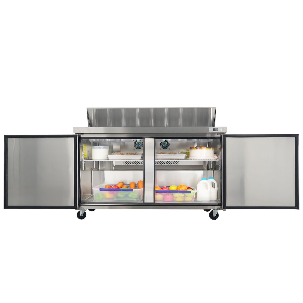 User-Friendly Design: The Salad Sandwich prep table refrigerator is designed for easy movement with caster wheels and wheel brakes for stability. It has 5'' wheels for easy cleaning, two rubber anti-collision blocks for improved heat dissipation, and two self-closing doors that stay open beyond 90° and close automatically below 90°, making it easy to use and more accessible.