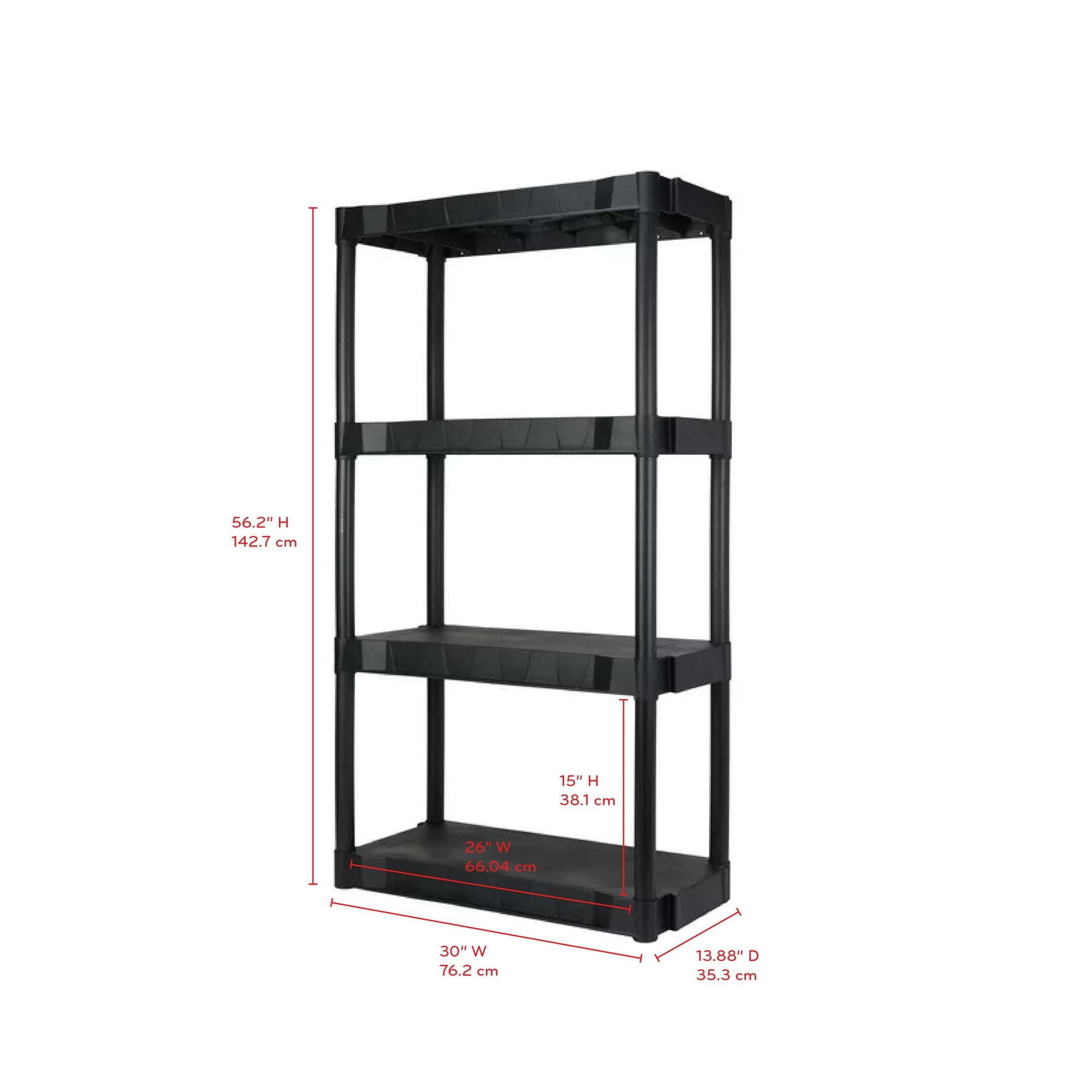This Adult Black Plastic 4 Shelf Shelving Unit is a great solution for all your storage needs. This is perfect for any space where you might need reliable, sturdy shelving, such as, the garage, basement, utility room or closet. It is made from a durable and long-lasting black polypropylene plastic that can hold up to 70 pounds per shelf when evenly distributed. This product has interlocking shelves that require no tools to assemble and comes with a QR code video tutorial. This shelving unit is easy to maintain and is built for years of use. Pick up yours today, while supplies last, only available at and .com.