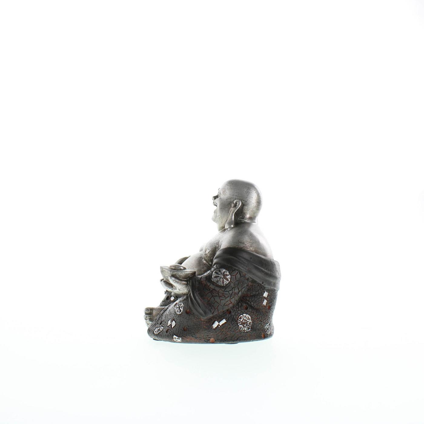 The Happy Buddha's sitting pose and big belly symbolize wealth and prosperity, while his infectious smile exudes happiness and luck. This silver and black statue is sure to inspire positivity in your home.