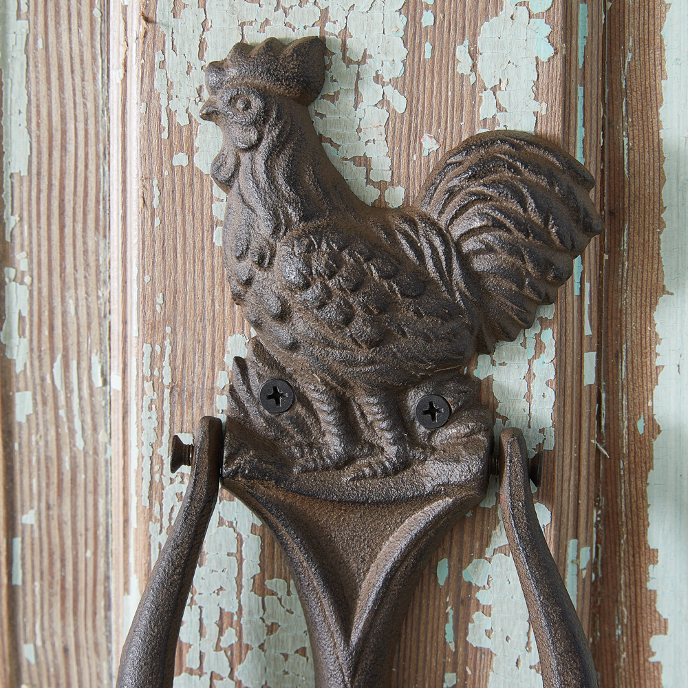 Elevate your home's curb appeal and make a statement that exudes rustic character. A symbol of tradition for a home entrance, our rustic door knocker showcases a proud rooster perched atop a sturdy mounting plate. This item is crafted from cast iron and ensures durability for years to come. To hang, use its two screw-hole hangers.