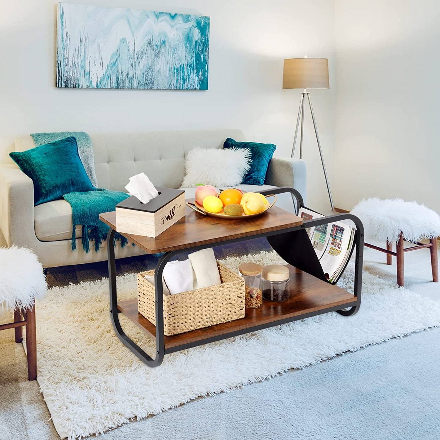 Modern 2-Tier Coffee Table with Magazine Book Holder Sling in Brown Wood Finish