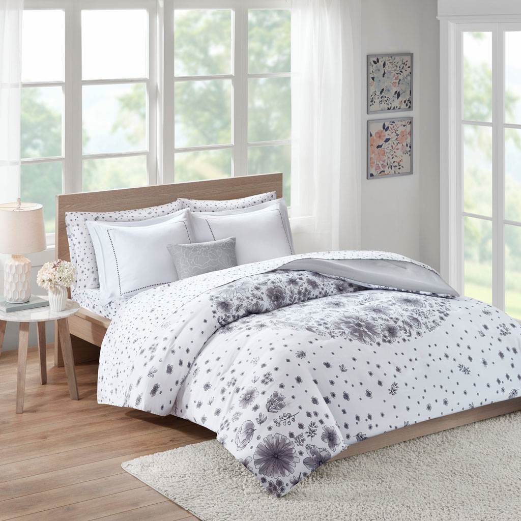 Twin size 6-piece White Grey Floral Pattern Microfiber Comforter Set