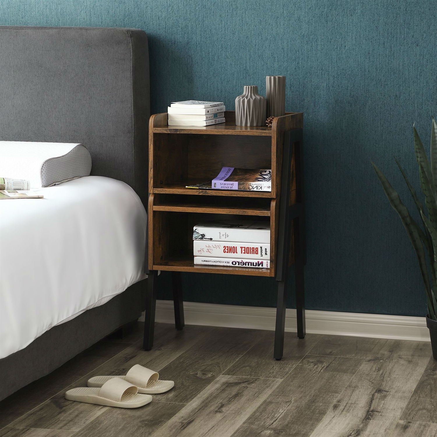 Home > Modern Stacking Open Shelf Nightstand End Table in Medium Brown Wood Finish
