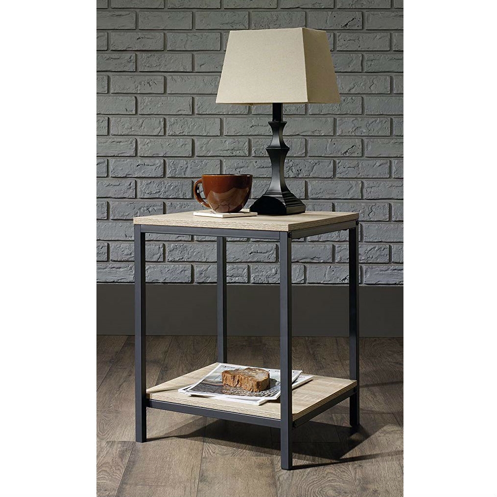 Modern Black Metal Frame End Table with Oak Finish Wood Top and Bottom Shelf